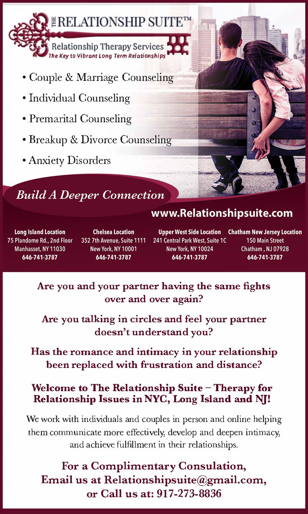 We are a group therapy practice specializing in couples and marriage counseling. Our team is composed of seasoned, highly skilled clinicians with decades of combined experience. As our practice has grown, we are proud to now offer in-person locations in both Manhattan and Long Island, providing accessible, high-quality relationship care to individuals and couples across the region. Read more>>