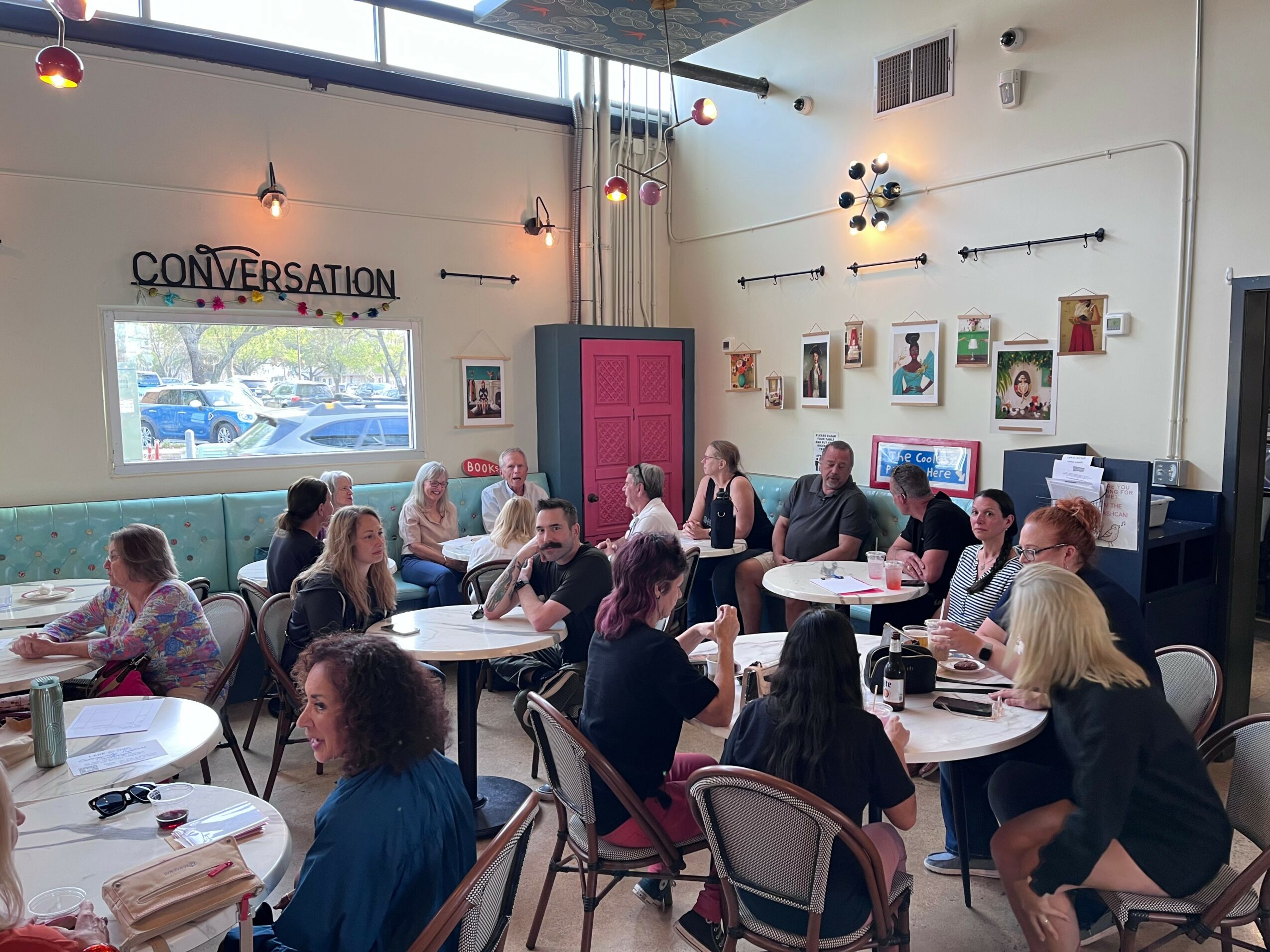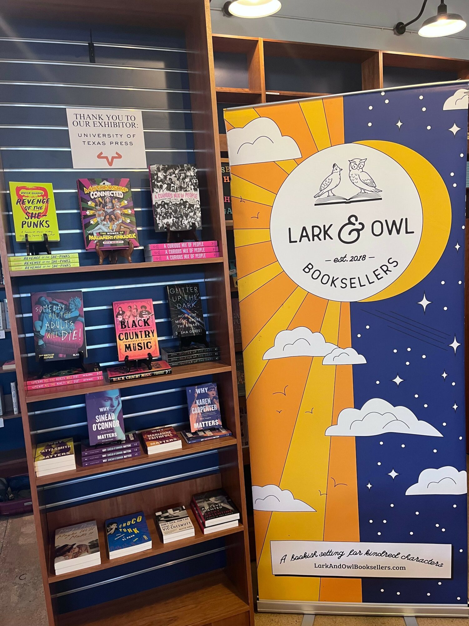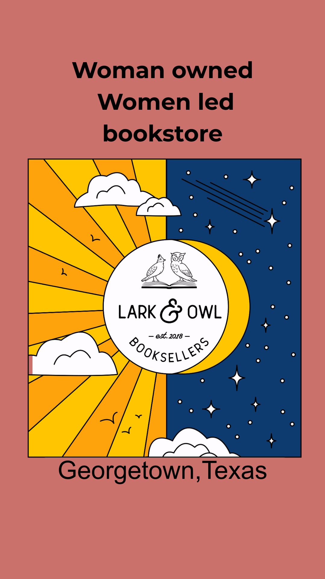 Lark & Owl Booksellers opened in April of 2019 and we’ve had great support from our community ever since. Georgetown had been without an independent bookstore for several years after the owner of Hill Country Books retired. Founded by 10 women who were committed to books, Lark & Owl has become a cozy, welcoming third place for many people in Georgetown and beyond. Our mission is to provide an inclusive place where people feel seen, where the books on our shelves reflect the vibrant community we serve every day. Our tag line is: Community + Conversation + Books.