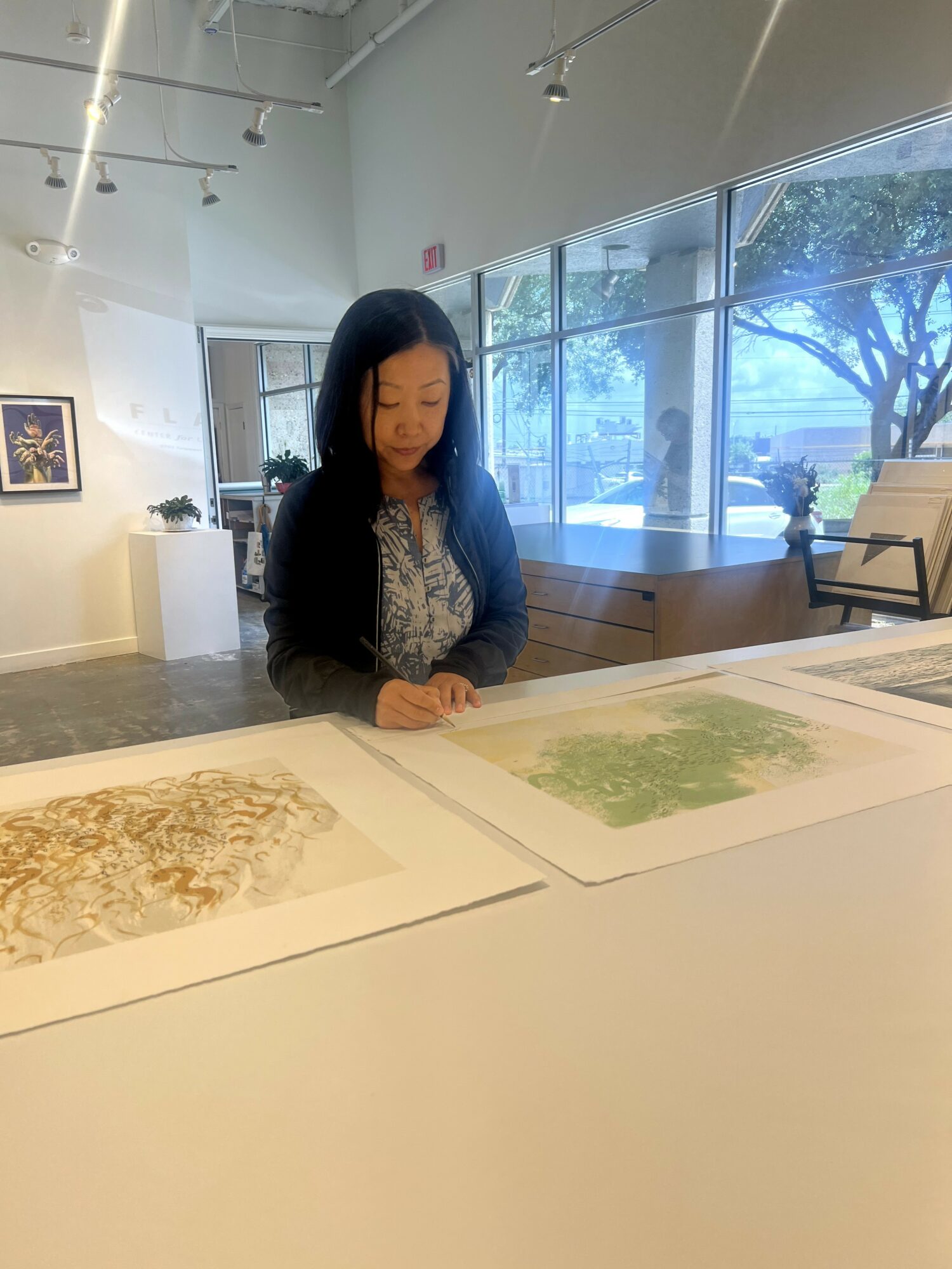 In 2019, our building was slated for destruction to make way for a condo project. We looked for comparable space in East Austin, but didn’t find an affordable space. Looking to the southeast sector, we found a flex-industrial center right off Burleson on Drossett Drive. We decided to lease 6000 square feet which would be big enough for our gallery, inventory storage, offices and two printmaking studios. We changed our business plan to create a studio for collaborative printmaking and a separate studio to share with the community through memberships. We reserved one space to sublease to another arts business. It was our hope that other arts organizations, studios and businesses would relocate near us building the kind of synergy we experienced while in East Austin.