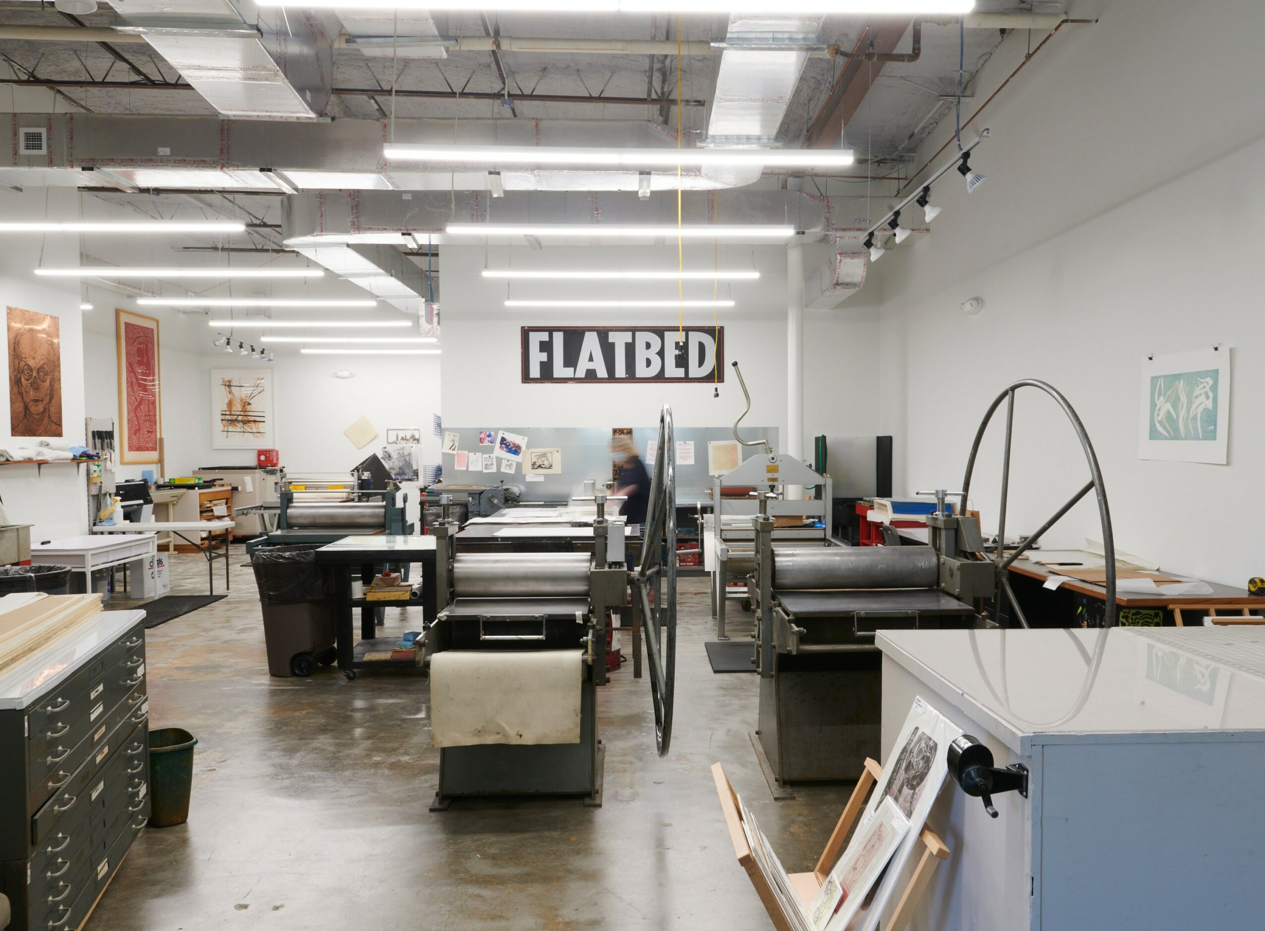 I had been teaching printmaking and other art classes for Austin Community College and St. Edwards University when I founded Flatbed. I continued teaching as an adjunct until 2000. For several years, ACC rented our studio to hold printmaking classes on weekends and evenings while they were between buildings.