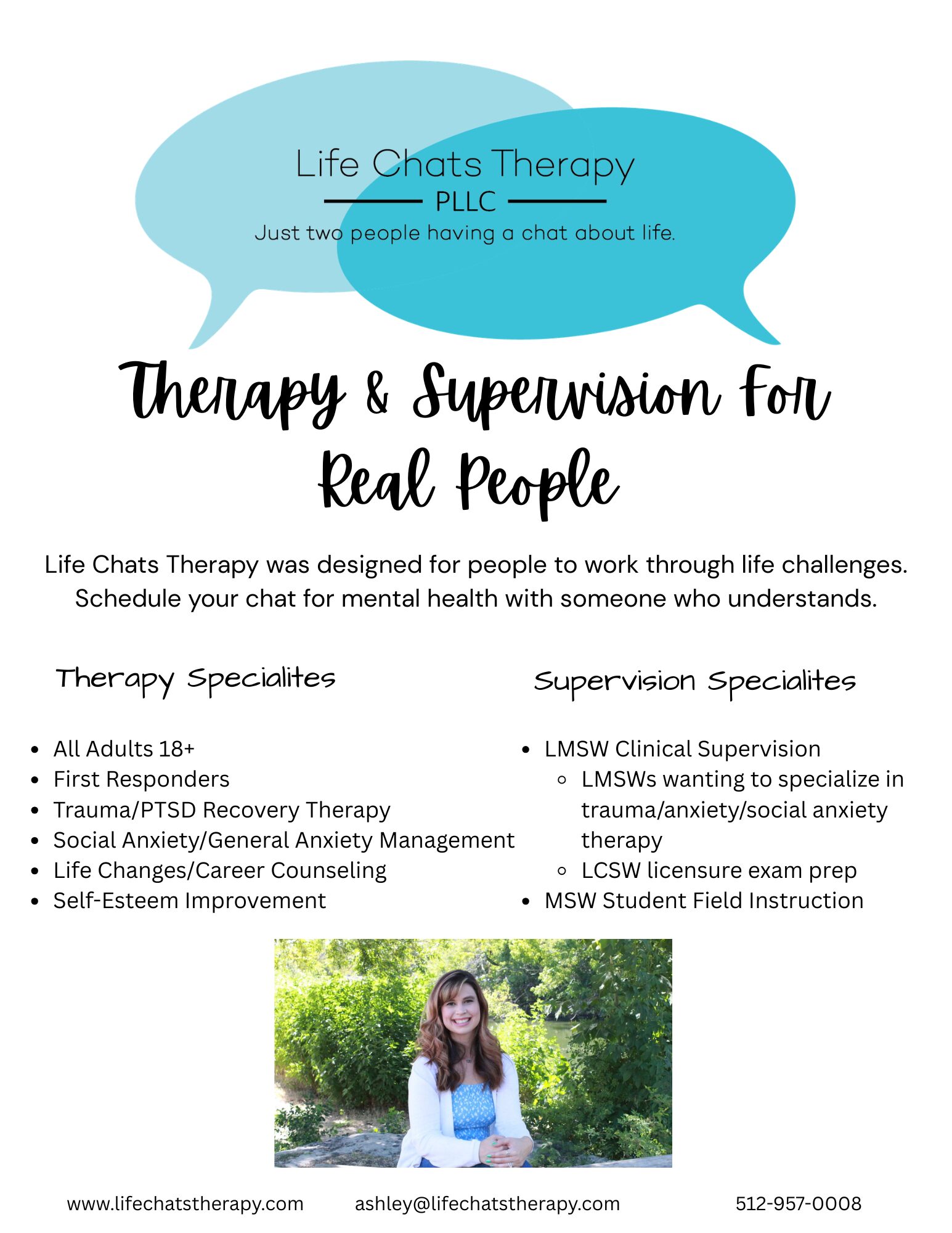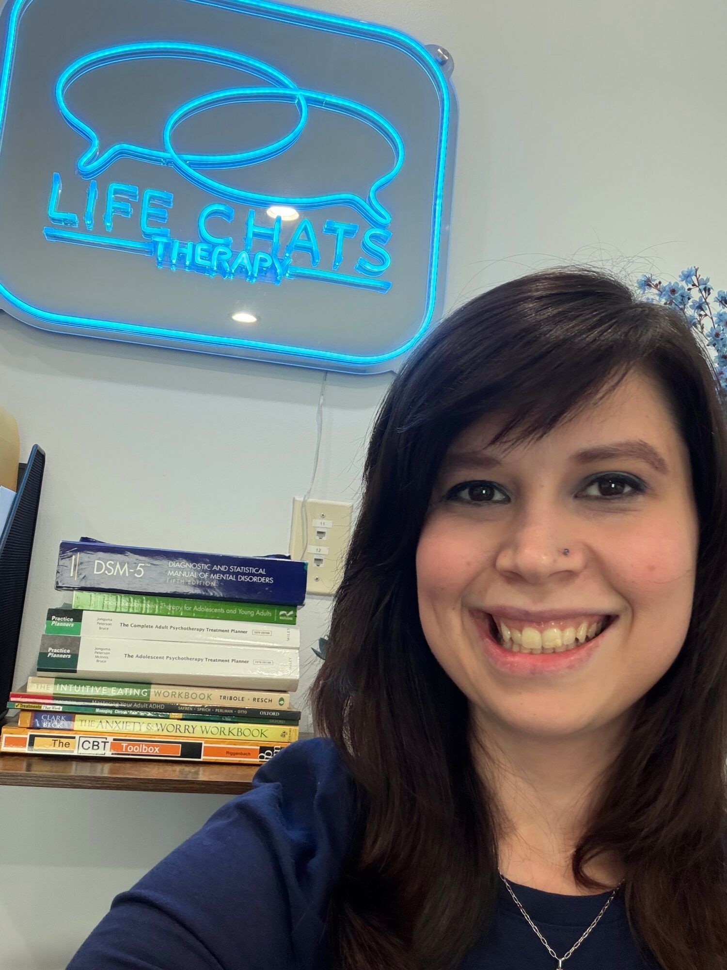 Professionally speaking, I have varied experience in the mental health world. Private practice was always the goal, but I wanted to be competent before I went out on my own. I have worked in a few different private inpatient mental health hospitals as a case manager and therapist. I worked for a community mental health center as a crisis assessor and therapist for those struggling with suicidal ideation, homicidal ideation, and or psychosis. I worked at the state hospital level, where I was the only therapist on staff caring for adolescents that had severe trauma and legal issues. After that, I was a civilian contractor for the United States Air Force where I provided therapy for active-duty Airmen. In 2019, my husband and I moved to Austin. I applied to hospitals and agency jobs, but also applied to Three Oaks Counseling and Psychiatry as a private practice therapist. They hired me almost immediately, and I almost turned it down because I questioned if I was ready to be in private practice. My previous clinical supervisor and my husband told me to take the job. I did. I learned so much about private practice and running a business during my time there. The colleagues I have there are amazing, and I am grateful to them for believing in me and helping me learn enough to get started on my own. In October 2023, I launched my practice- Life Chats Therapy, PLLC. I have been working in and on my practice ever since.