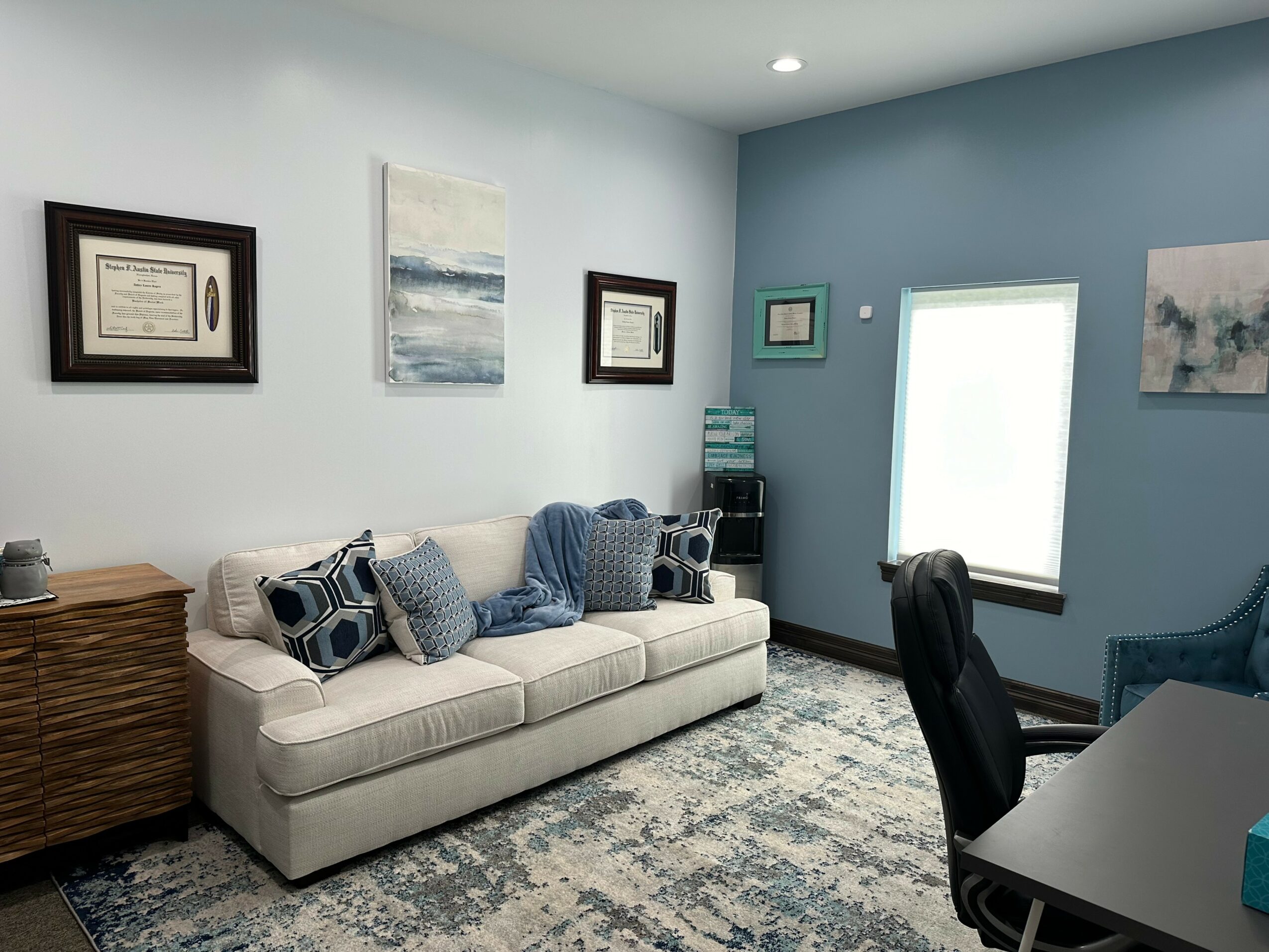 Parts of this journey have been smooth, and other parts have been super rocky. Completing my MSW was probably one of the most difficult things I have accomplished in adulthood. I was in an accelerated program (18-hour semesters, many very long papers, lots of reading) working full time (at a mental health inpatient hospital) due to financial necessity, and commuting 150 miles a day between work, school, and home since I lived in a very rural area at the time. This meant starting my day at 5 am and often getting back in bed at 11 pm since classes ended at 9 pm, and I had a commute home. I worked, went to class, did homework, and slept a few hours each day. This was my life for 10 months. I also had an MSW school internship supervisor that told me my trauma history is too severe to do the kind of work I wanted to do. All of this made me want to quit about two or three months before graduation. Lucky for me, I have an amazing husband who wouldn’t hear of it and told me to keep going. I did and I finished. I knew I had to finish if the message I want to share with people is to be heard from someone who has lived it- You can do or be anything you want to do or be as long as you’re willing to work for it. Your past doesn’t define you or limit you unless YOU allow it to. We also had to move eight hours from all of the people and places we knew in 2017 for my husband’s dream job. I was about eighteen months through my twenty four month internship to earn my LCSW. I still finished, but it did delay the process. This delay would turn out to be a blessing in disguise. It was the first step (unbeknownst to me at the time) to my private practice career.