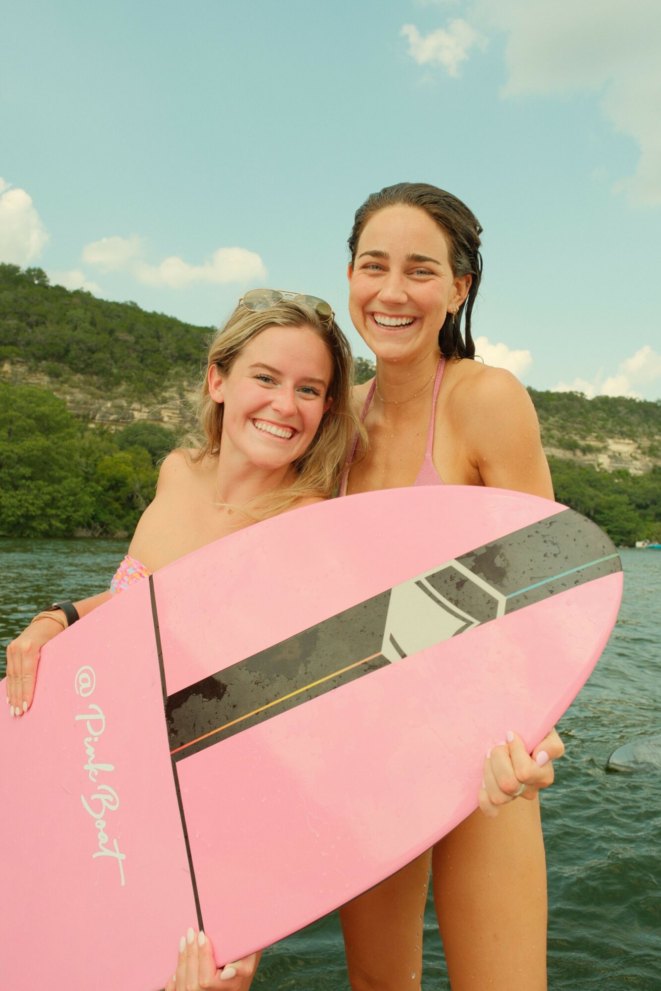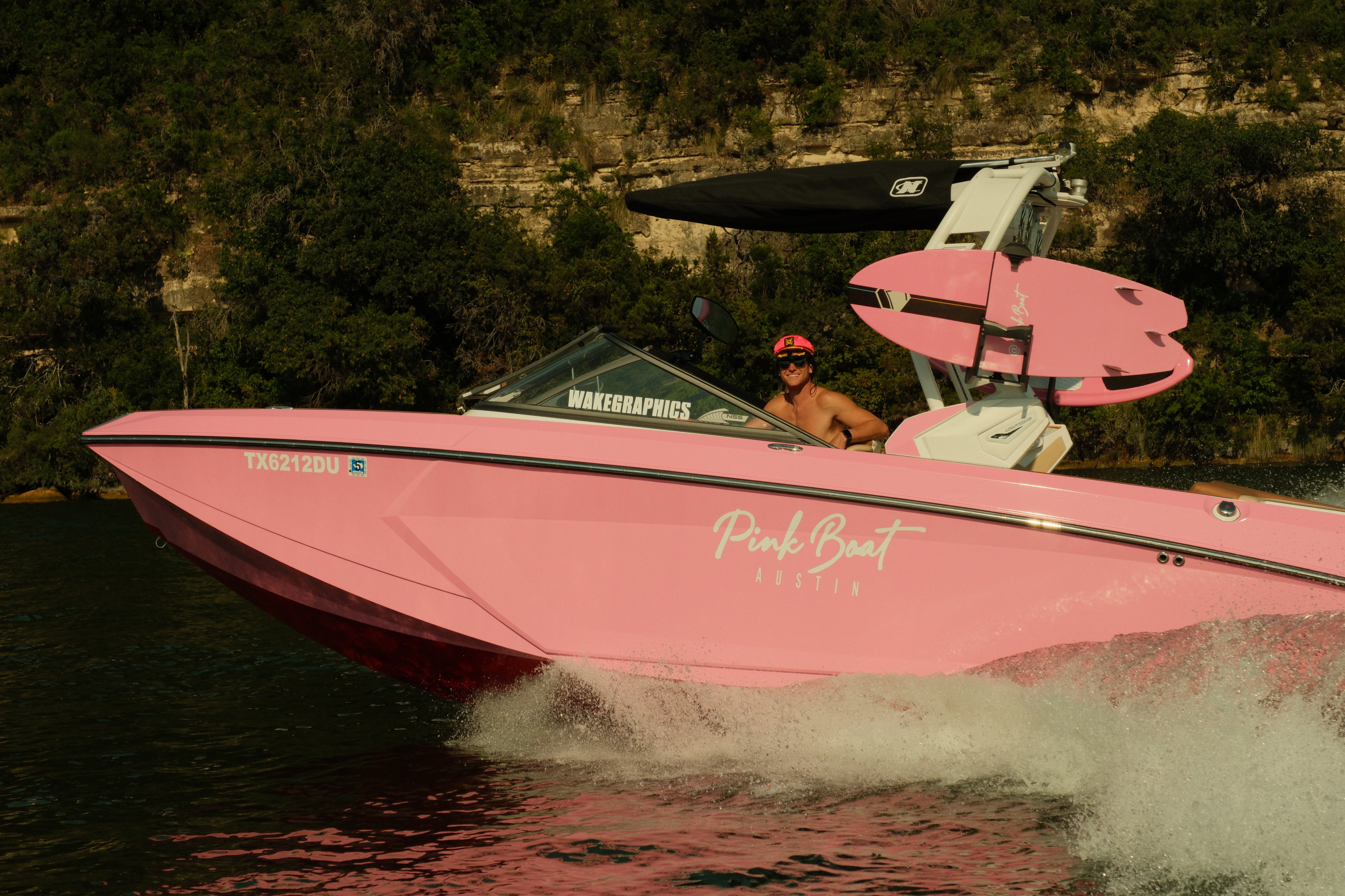 Pink Boat Austin is a one-of-a-kind lake day experience. Aboard our all-pink wake boat, you’ll see Lake Austin like never before. Whether you’re surfing, swimming, or simply taking in the views, we make every moment picture-perfect.