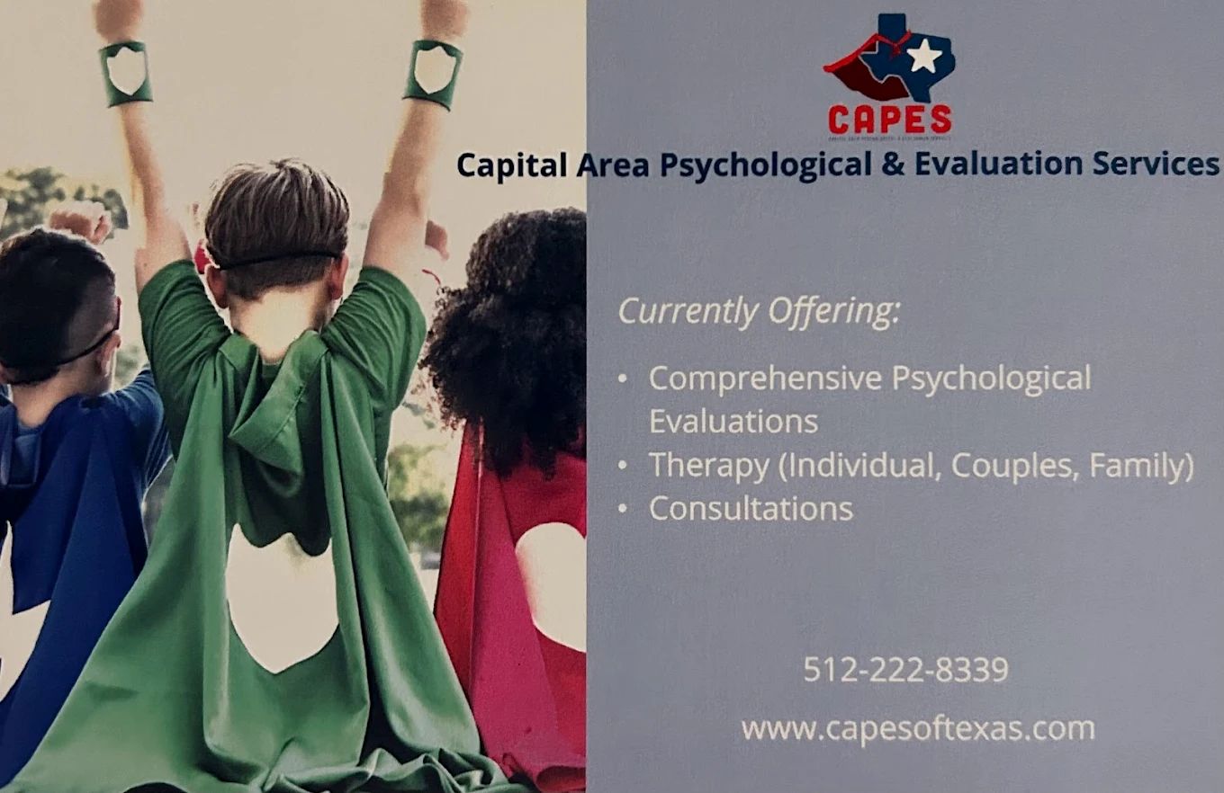 Capital Area Psychological & Evaluation Services, CAPES, is a group of licensed psychologists committed to providing high quality, individualized psychological services to children, adolescents, and adults. CAPES was formed by Dr. Melissa Case-Vincent in July 2020. CAPES is woman-owned and operated and honored to serve Austin and the surrounding Central Texas communities. We currently conduct psychological assessments, in person, and provide psychotherapy and parent consultation, in person and through telehealth. CAPES specializes in autism, ADHD, learning disabilities, and mood difficulties. We are known for our individualized assessments and our psychologists have diverse backgrounds and areas of expertise. CAPES is proud to be helping people gain insight into their difficulties, whether neurodivergence, learning disabilities, behavior difficulties, or mental-health concerns. Our therapy services aim to be client-centered and address each person’s or family’s unique needs.