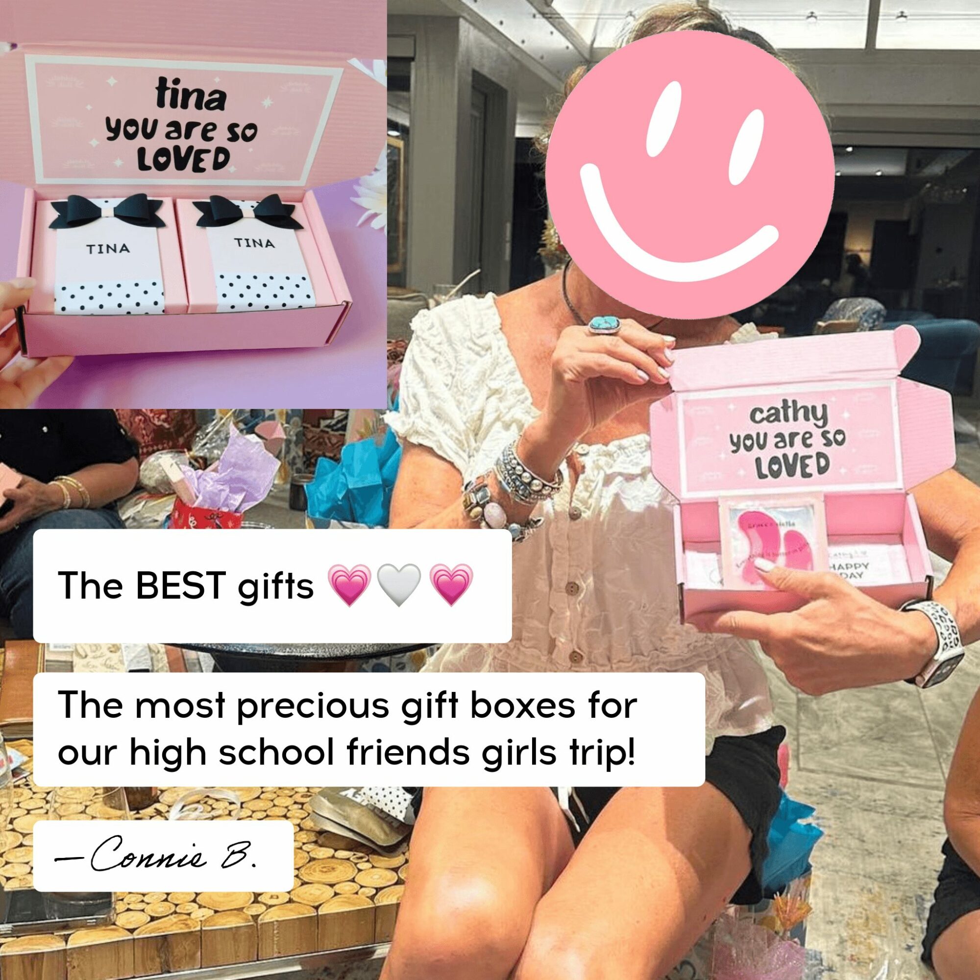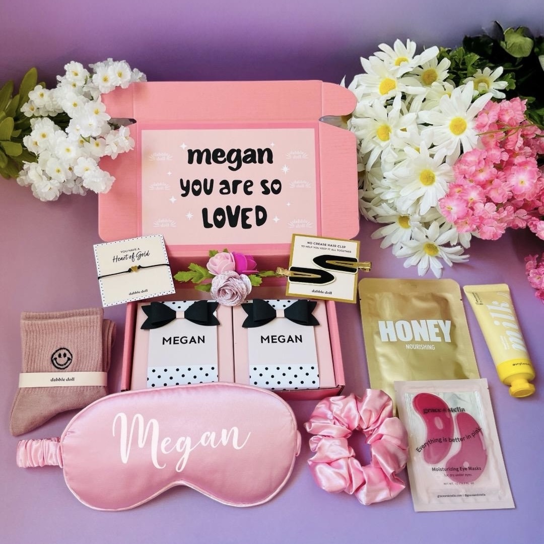 • Happy Gift Box: $34 – A cheerful set featuring a Jar of Happy with inspiring quotes, smiley face socks, a pink silky satin sleep mask, a scrunchie, a sheet mask, collagen eye masks, and a charming everlasting paper flower bouquet.