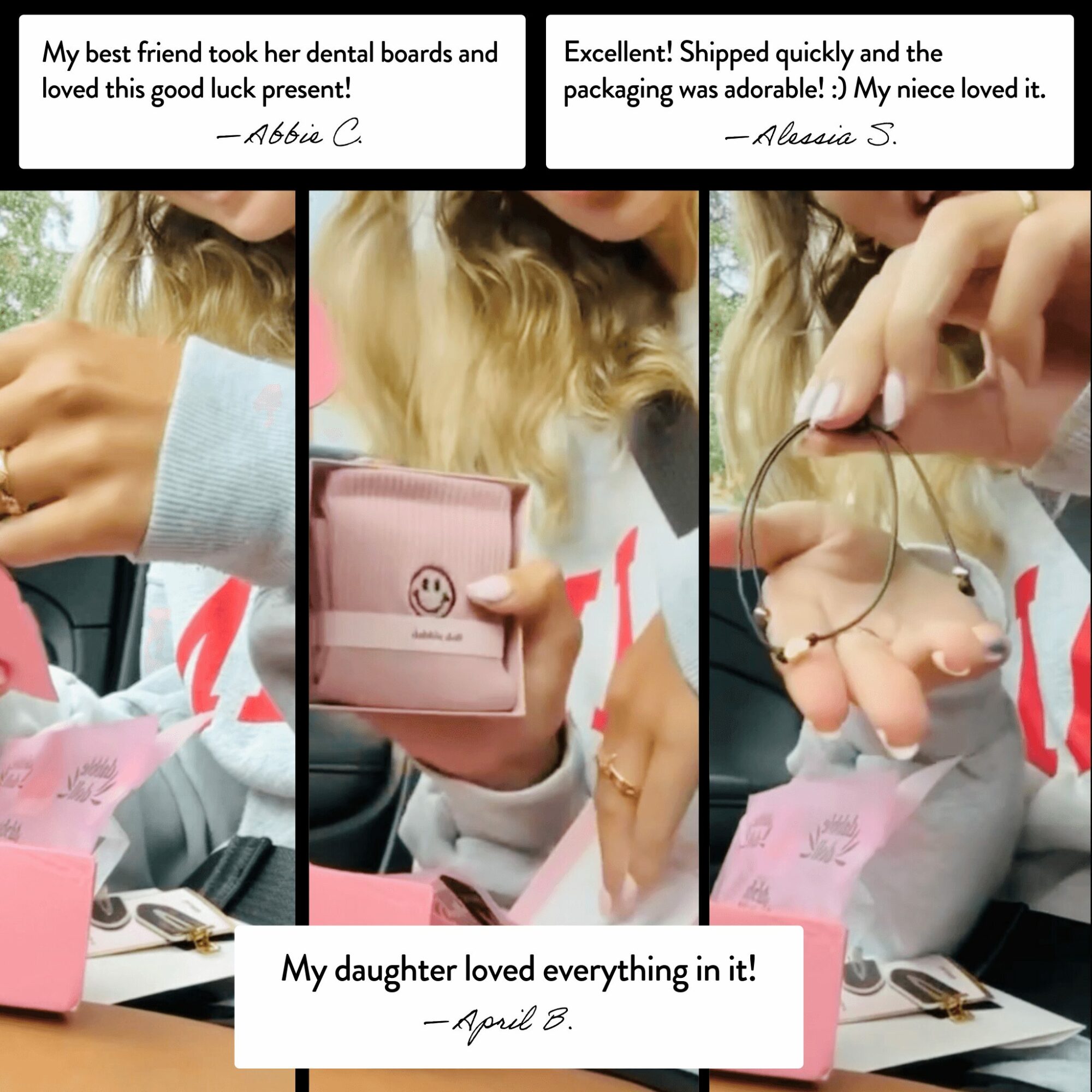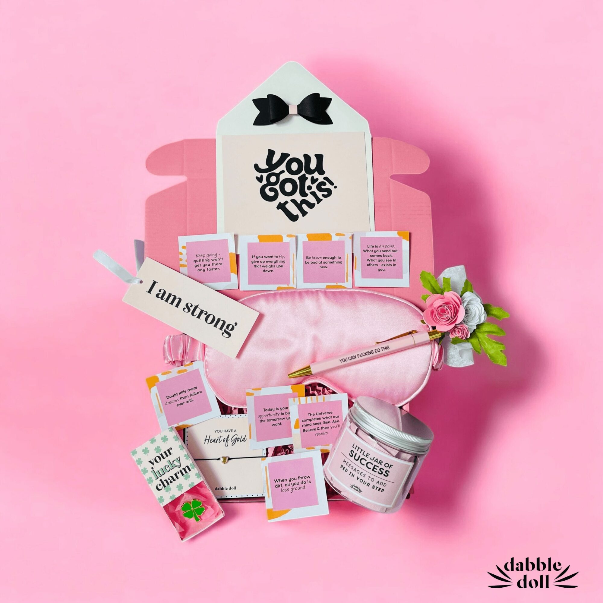 • Success Gift Box: $39 – A thoughtful collection featuring a Success Positivity Jar with 30 uplifting cards, an “I Am Strong” bookmark, a four-leaf clover enamel pin, a gold heart bracelet with a cute backing card, a pink silky satin sleep mask, a charming everlasting paper flower bouquet, and a motivational pen.
