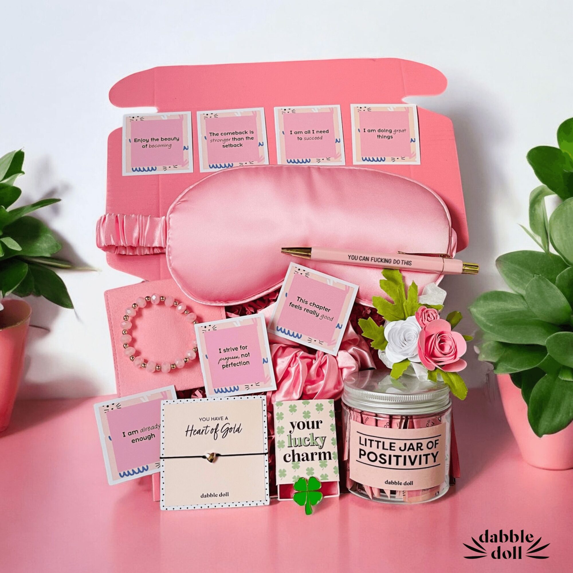 • Positivity Gift Box: $42 – Packed with good vibes, this box includes a Positivity Jar with 30 uplifting cards, a four-leaf clover pin badge, a gold heart bracelet with a cute backing card, a pink silky satin scrunchie, a pink silky satin sleep mask, a beaded bracelet with a gift pouch, a charming everlasting paper flower bouquet, and a motivational pen.