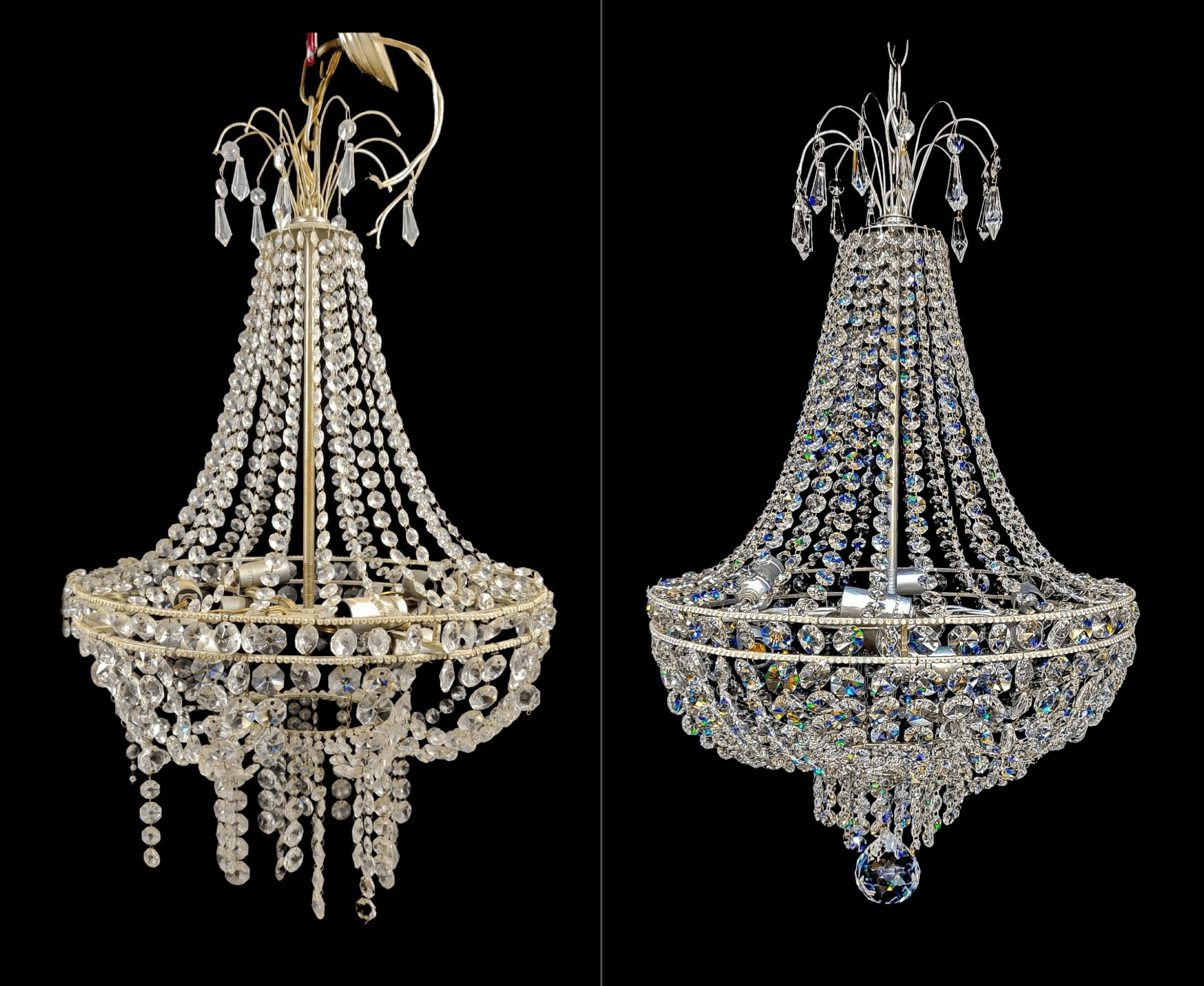 We specialize in all things chandelier, with a strong focus on restoration work. We have seen so many chandeliers come from ‘grandma’s attic’, homes that were hit with natural disasters like floods, homes that had a small scale fire that covered the chandelier in soot – we’ve seen it all. We have a great number of vendors that we trust to give us quality parts and pieces to ensure that our restorations are as accurate and high quality as possible.