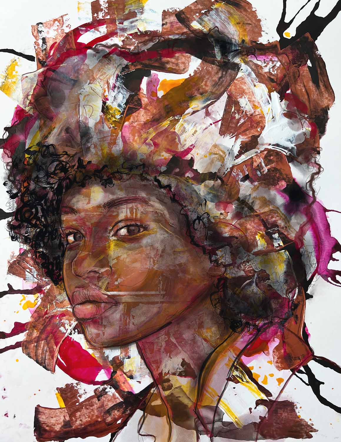 My artwork uses a mix of media, focusing on colorful portraiture. In the past, I have created fine art photography portraits, some of which are overlaid with watercolor, acrylic, and film. Other pieces are ink, watercolor, acrylic, and film on paper. Last year, I added sculpture to my repertoire, and I am working on my next art show, scheduled for 2026. What sets me apart is my love of exploring different mediums to express the beauty of innate humanity, primarily through portraiture.