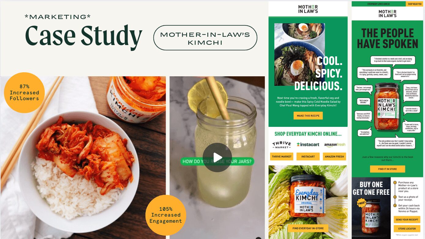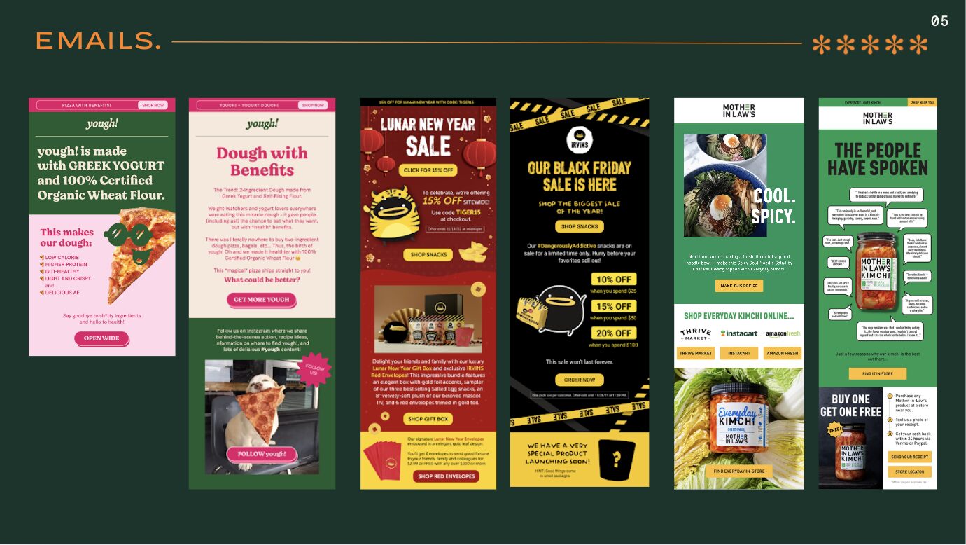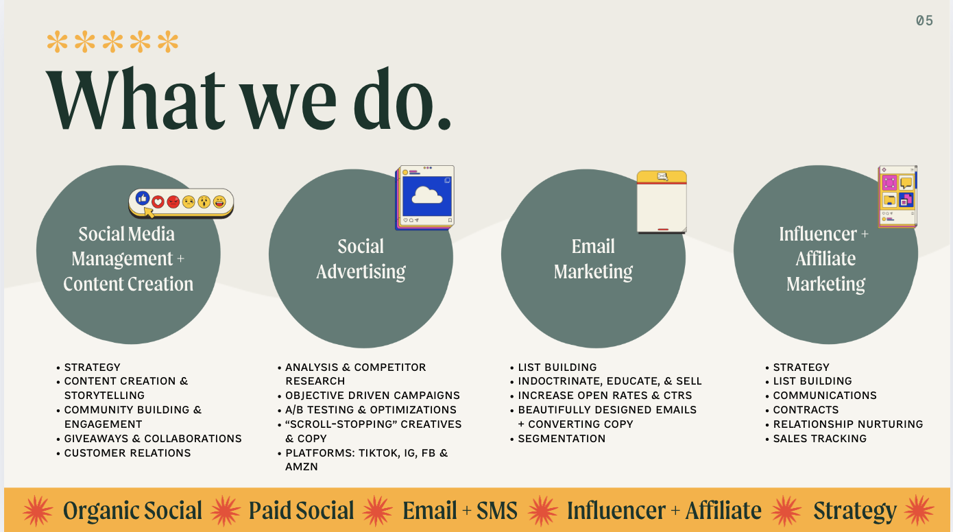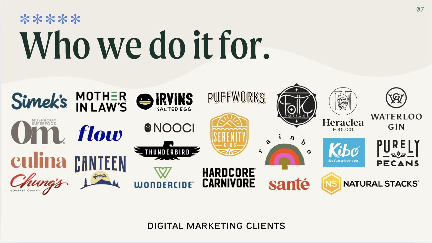 Brands we’ve helped grow: Om Mushroom, Serenity Kids, Natural Stacks, Mother-In-Law’s Kimchi, CANTEEN Spirits, Puffworks, Wondercide, Waterloo Gin, Hardcore Carnivore, IRVIN’s, etc.