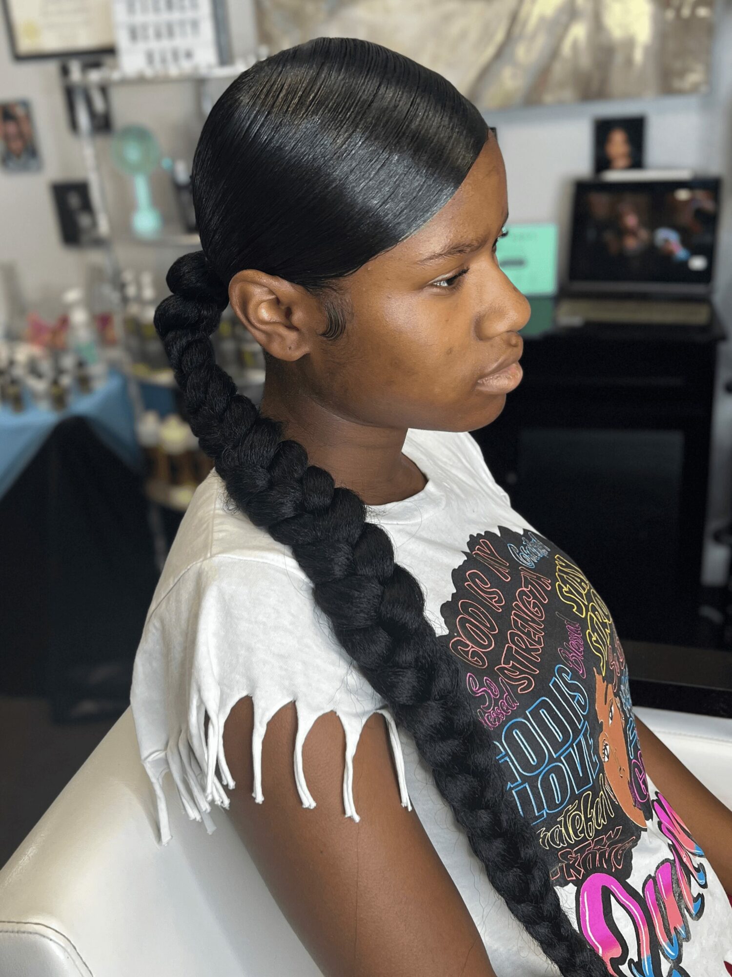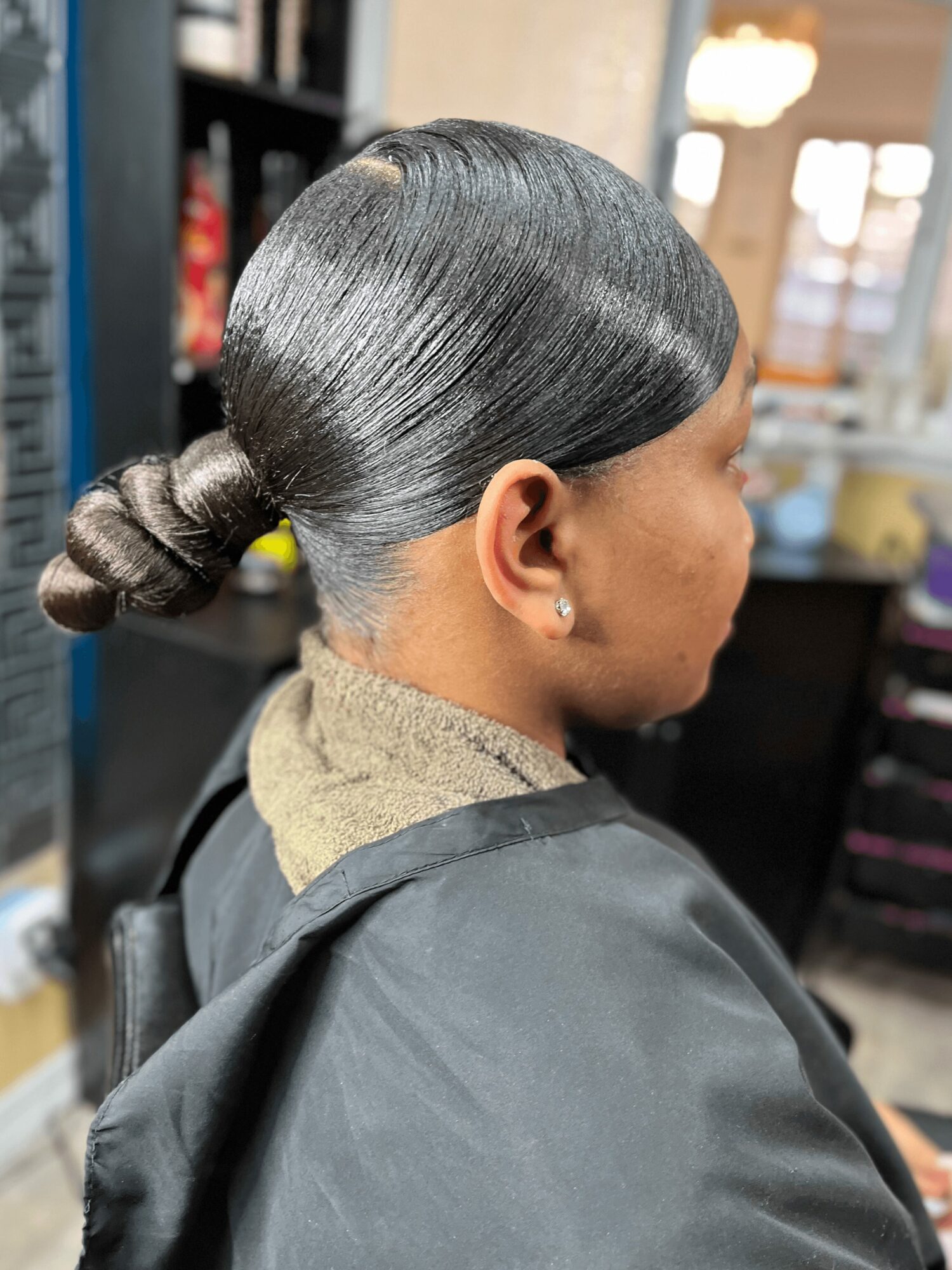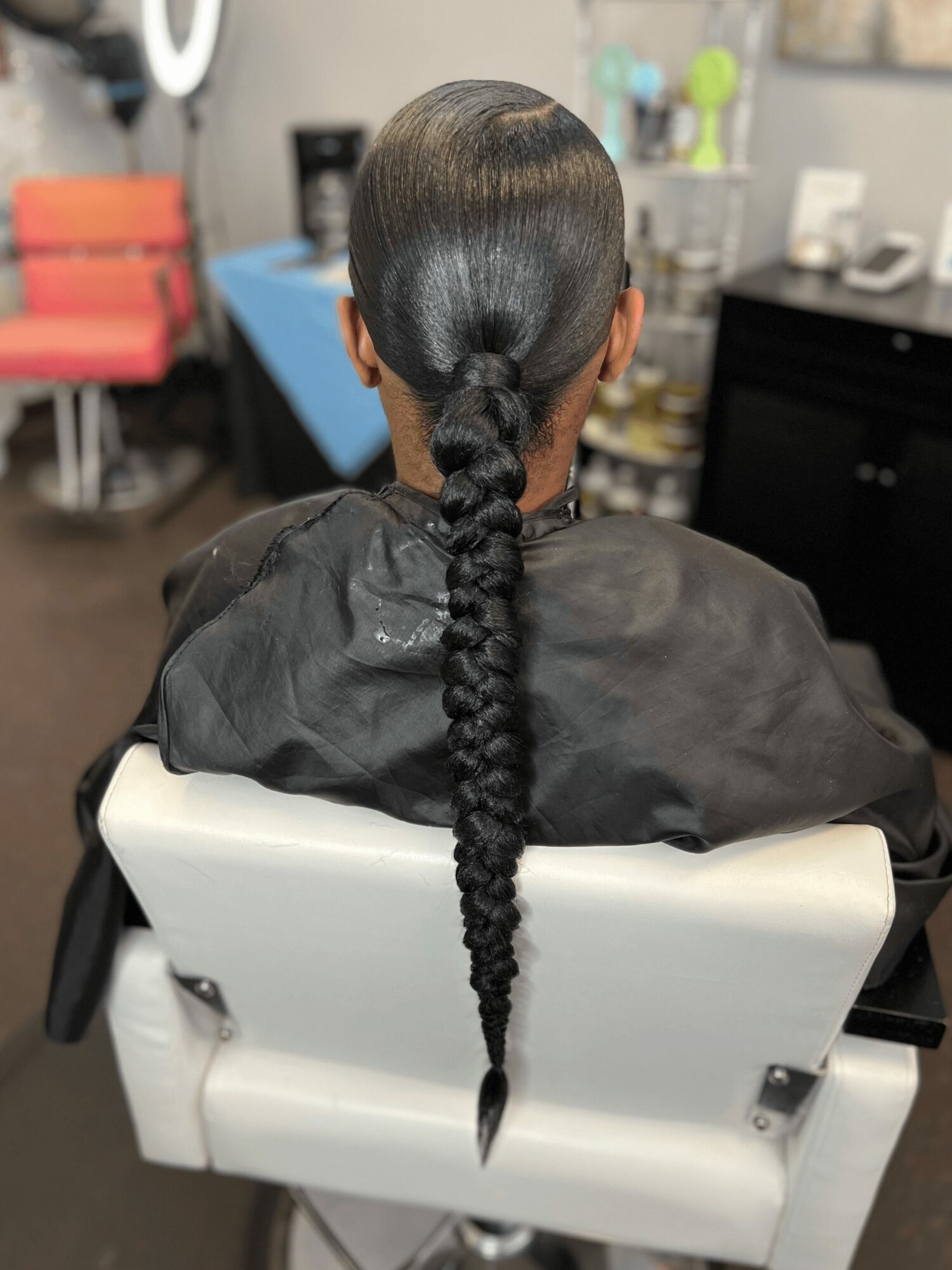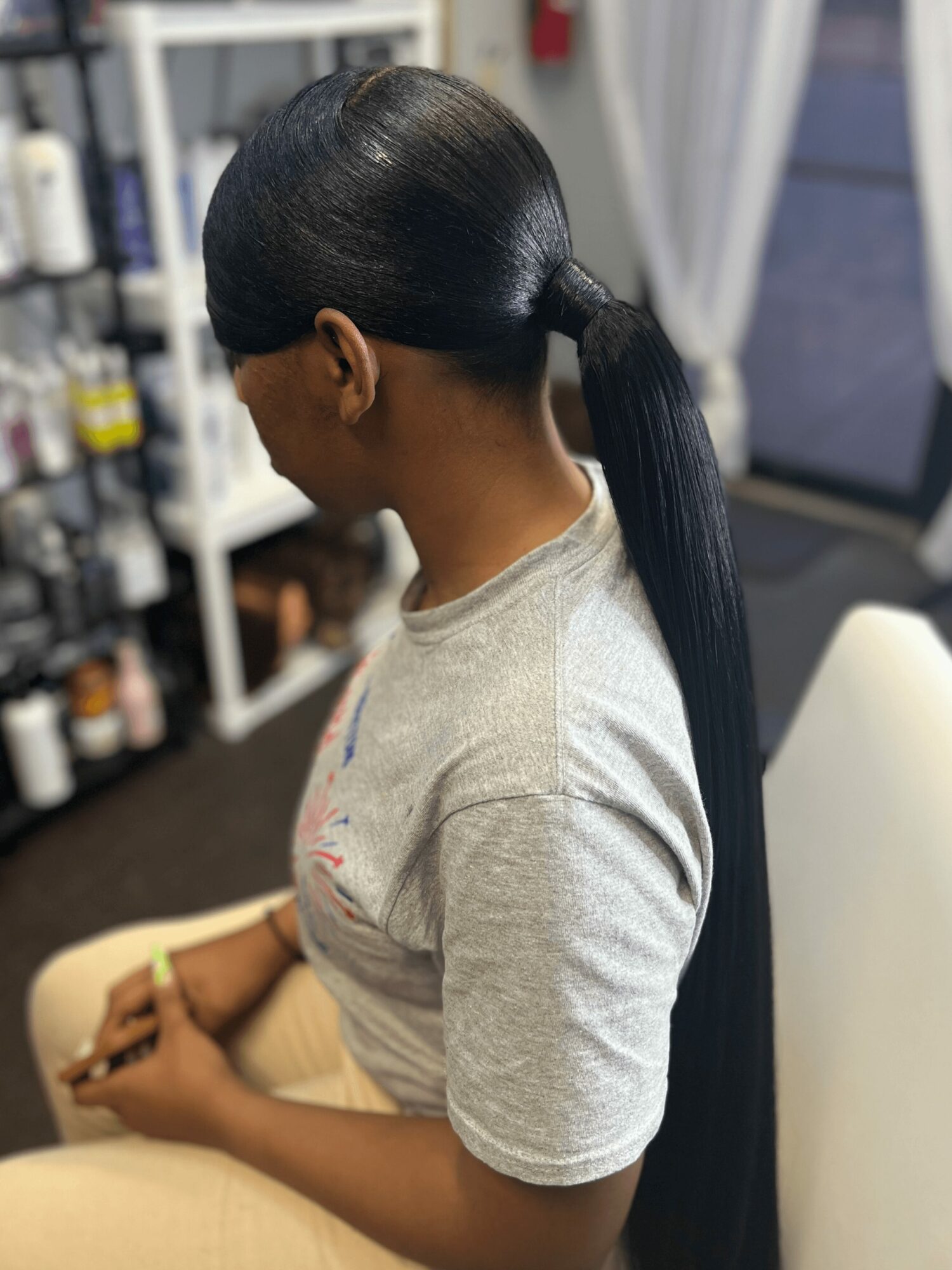 I specialize in growth-focused services including my signature ponytail services, protective styling, smoothing presses, and scalp therapy. My ponytail services are one of the things I’m best known for, they combine detailed preparation, proper tension, and techniques that protect the scalp while still delivering a clean, polished look. Every service is approached with the goal of maintaining the integrity of the hair, not just achieving a style.