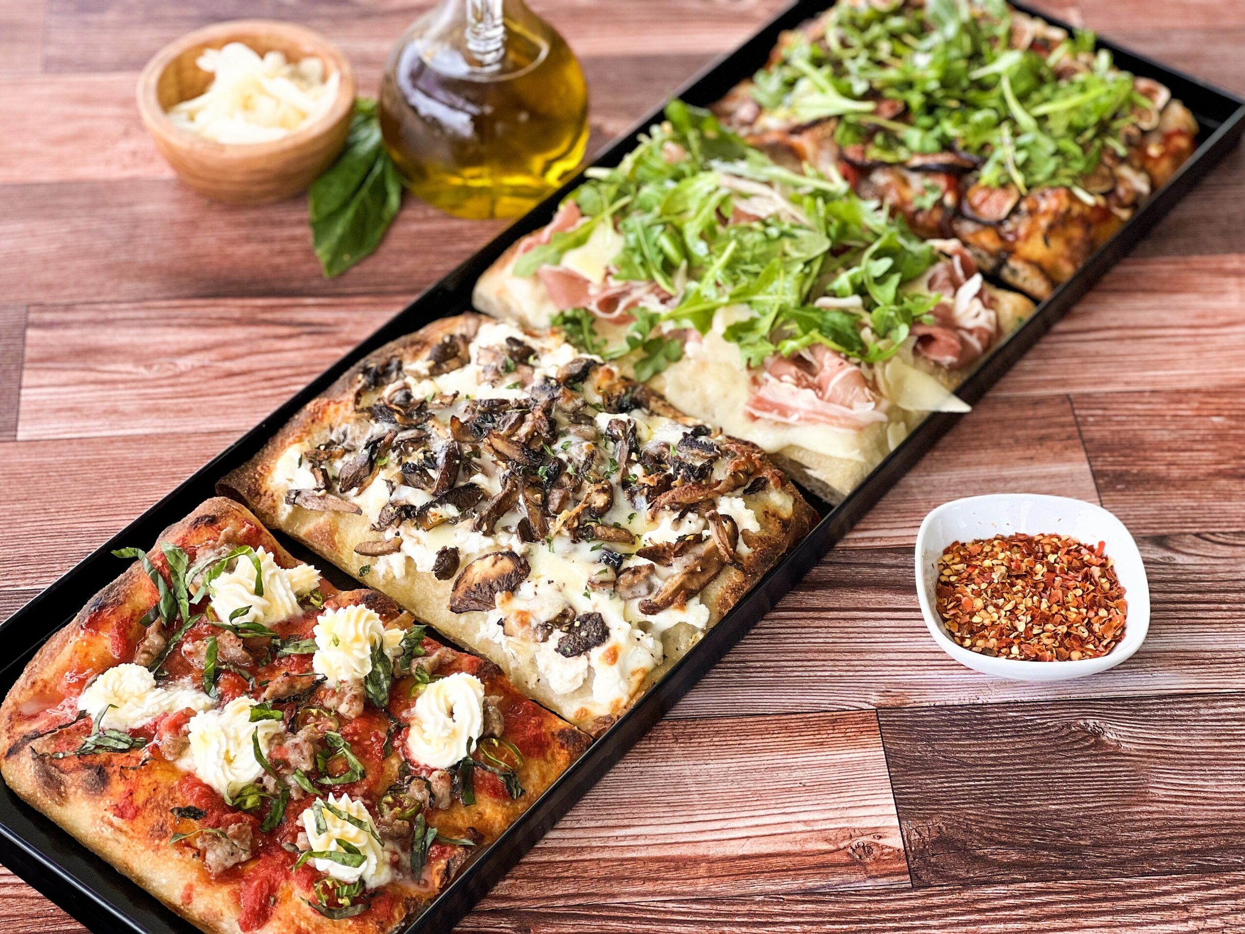 At the same time, there is a whole category of pizza invented in Italy that most Americans don’t know about and have never tried, which is Roman-style pizza. In Rome, it is called ‘pizza al taglio’, which translates to pizza by the cut. This style of pizza was created by bakeries in Rome who made a very different kind of dough from Naples pizza and baked it in large square trays. Roman pizza is made with high hydration dough which is left to rise for 72 hours, creating a light and flulffy yet chewy dough akin to Ciabatta bread. We import finely milled Caputo flour from Italy and bake the dough in blue steel pans and traditional Moretti ovens, both of which are imported from Italy as well. Because it is hearty enough to hold toppings, but easier to digest and doesn’t leave you with a heavy feeling after eating it, we think Roman-style pizza is going to be the next big trend in the U.S.