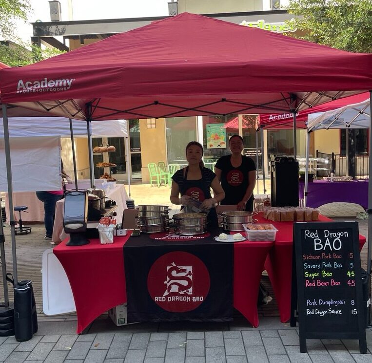 You can find us at Lakeline Farmers Market on Saturdays from 9am to 1pm (next to Jared’s), and at The Domain on Sundays from 12pm to 4pm. We also take online orders, via email order@reddragonbao.com or on our website https://reddragonbao.com. You can also look us up on Instagram and DM us any questions you may have! We cater all events, deliver our food frozen or hot and fresh, and we can even cook our food at your home or office.