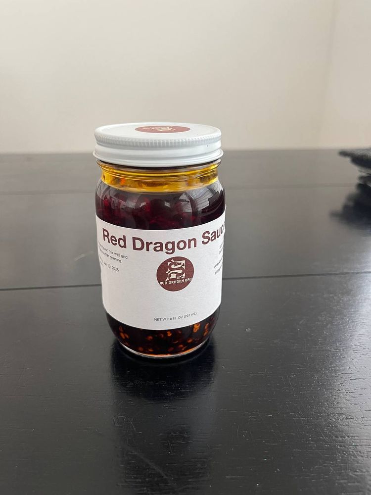 * Red Dragon Sauce — we flash fry crushed red chili peppers in an infused oil using a family recipe. Our sauce is very popular and is complimentary with any order. We also sell our sauce in jars.