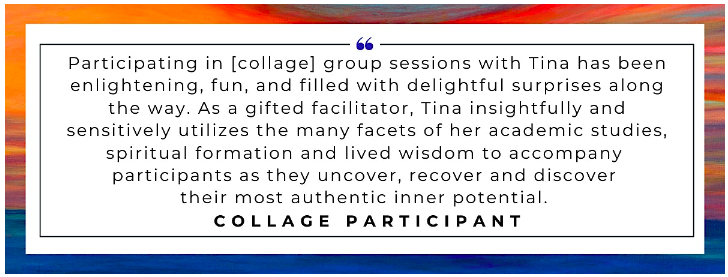 One time, during a group collage session, a woman came to my first session of my 8 week collage series, and she didn’t show up for the second session. I just “happened” to run into her at the local grocery store, and I asked where she had been. She said she thought it was only for one session. I got to invite her to return. In that next session, she shared trauma after having lived through the tornado that had passed through her street that spring. After the collage session, she shared with the entire group, “I just healed some of that tornado!” I just held space, listened, and healing happened.