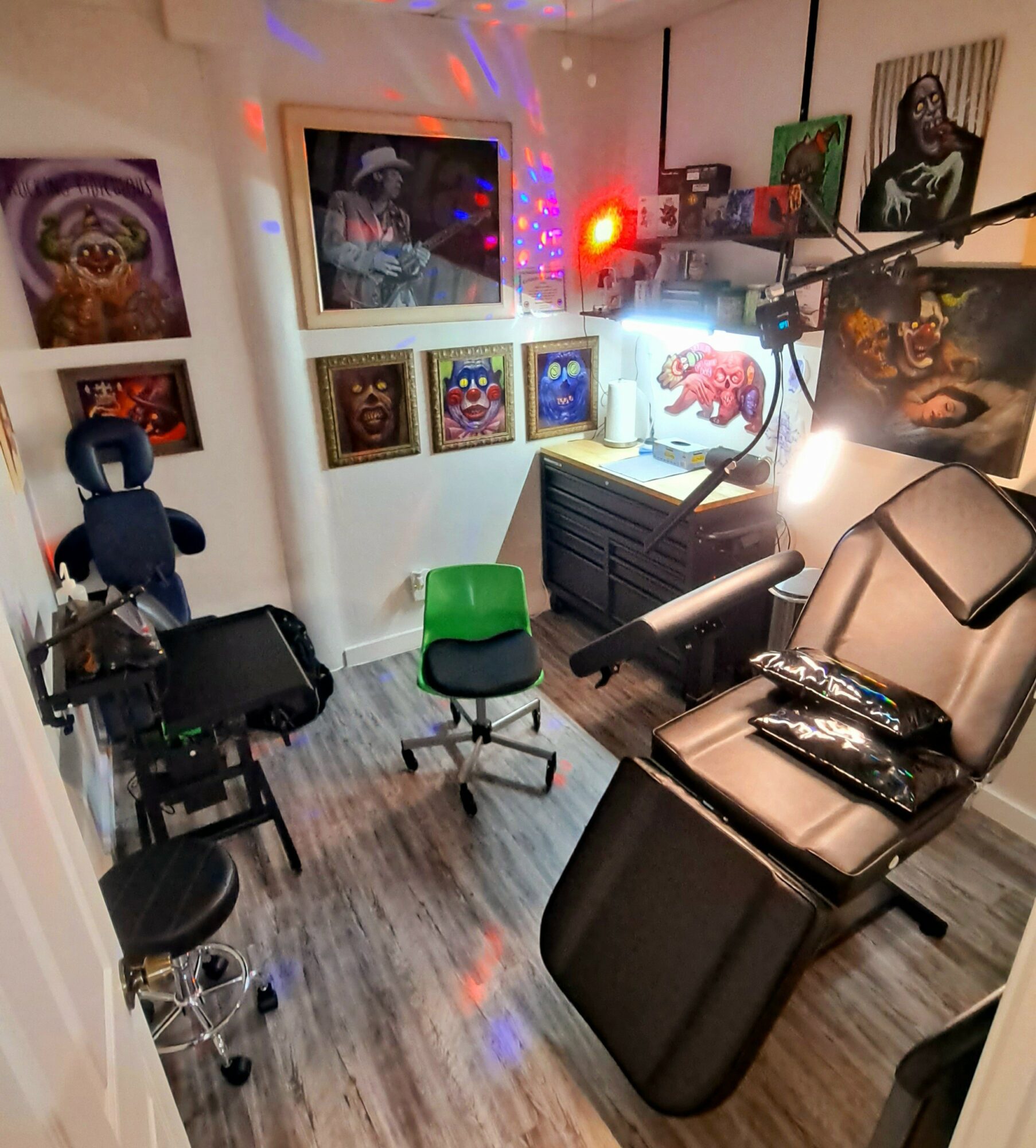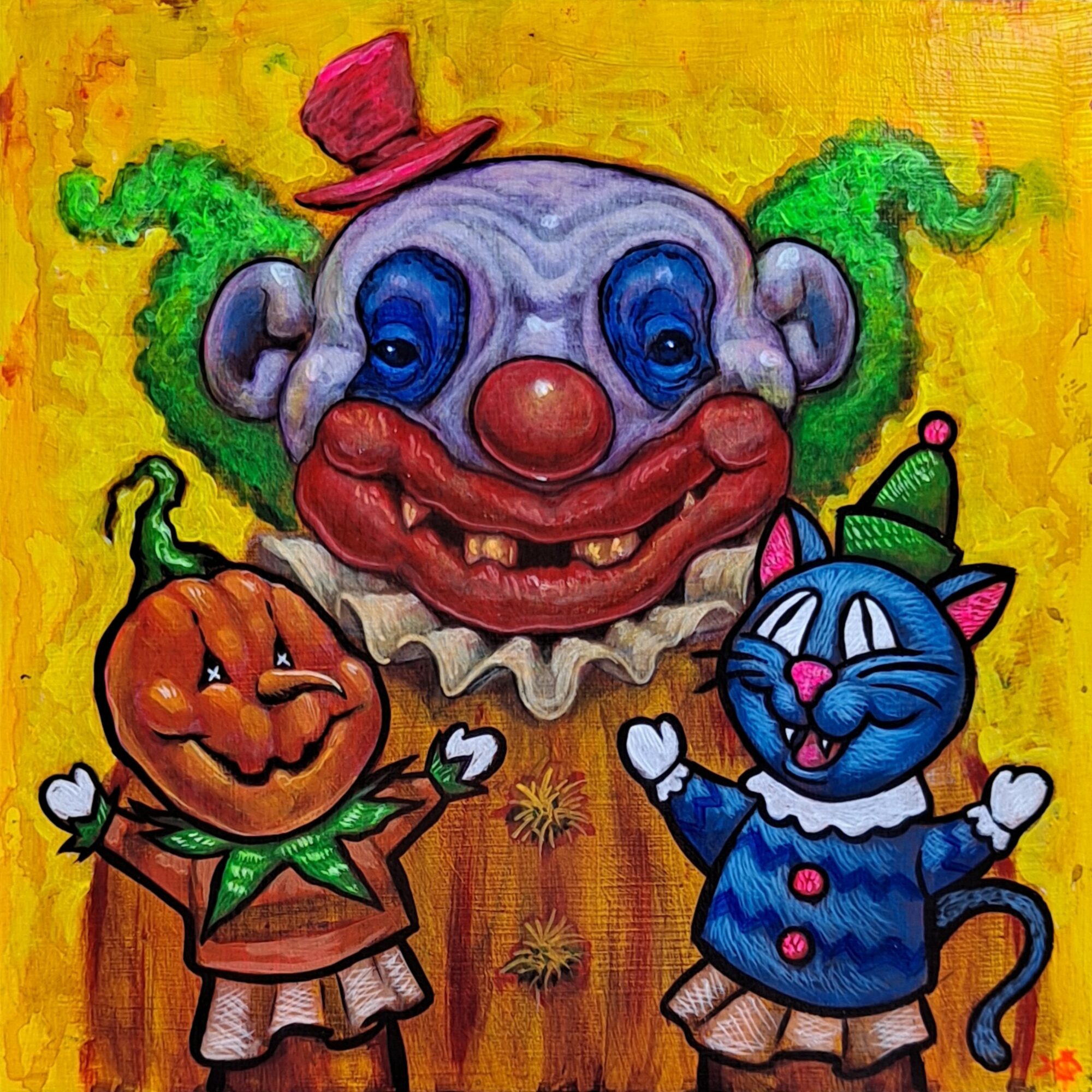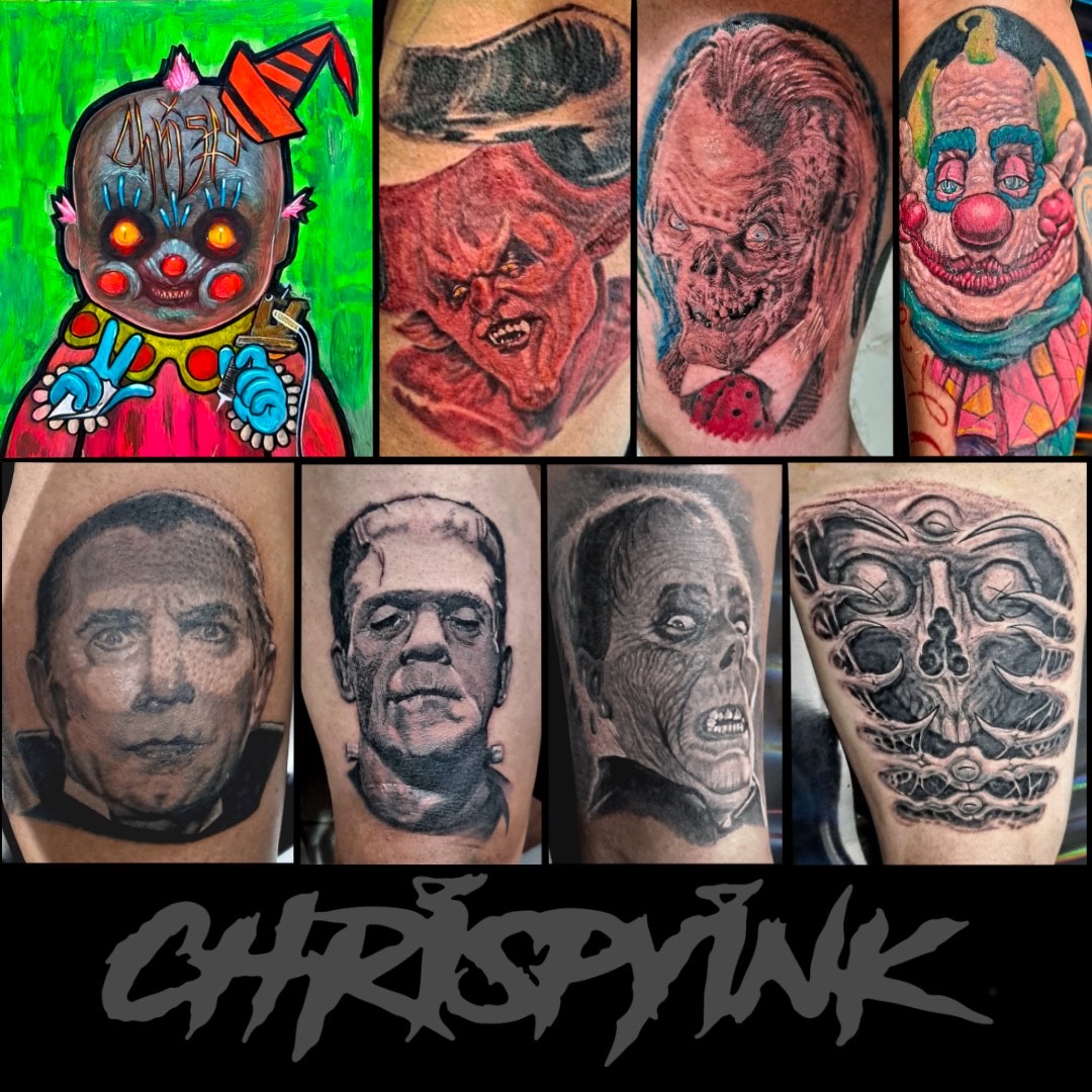 I’m a renaissance man, I like to do and can do many awesome things. My artwork is traditionally made but I like to paint scary stuff, silly stuff and everything in between. I love to paint clowns and gross-up close-ups 90s cartoon style. I look forward to displaying work around town this summer. My tattoo work tends to be detailed. I specialize in dark and colorful horror pop art.
