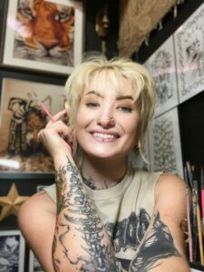 I hand paint all my work. I don’t use any stickers or decals, foils, etc. I just prefer to paint it all. I offer a service called a ‘freestyle’. Which is exactly what it sounds like, I just come up with something at appointment time. Freestyles are fairly popular I would say, I think it takes the stress of decision-making away from the client and it offers me creative freedom. I put out some of my best work that way too I think.