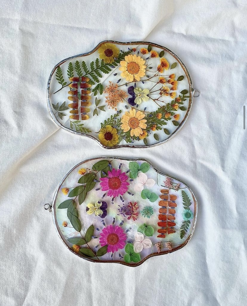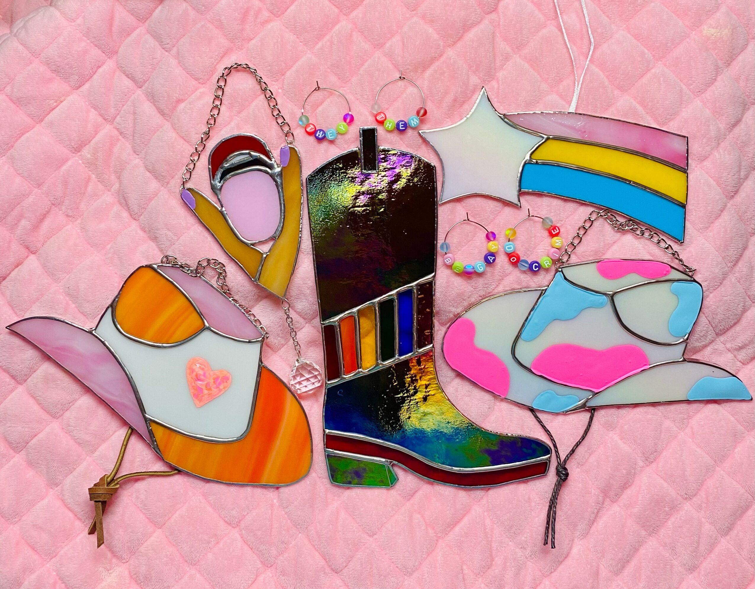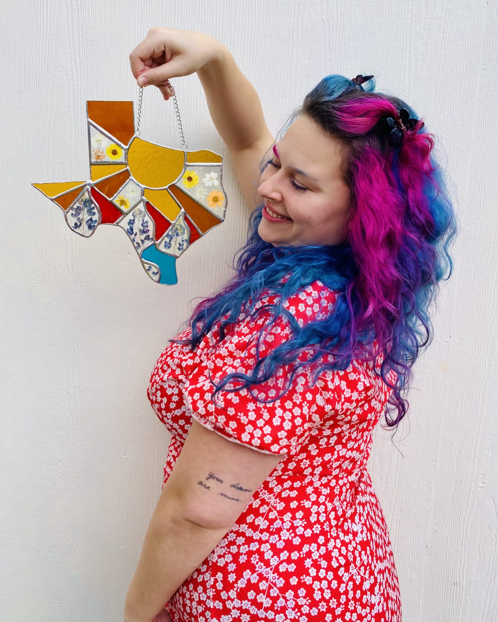I’m an incredibly sentimental person. My work is a celebration of all the things in life that are closest to my heart. The TexMex traditions and foods I grew up with, the wildflowers of Texas, the marriage of southern and queer culture that blossoms in Austin, Y2K nostalgia, and the resistance of those who are oppressed. The pieces I am most proud of are those which represent liberation & and have raised money for charitable causes. Regardless of subject matter, all my pieces tend to be loud and joyful. I love working with bright transparent glass that transforms the light in a room. I get so much joy from creating silly and pretty things that my inner child would like. What I make now is not so different from what I would make as an 8 year old, just in a different medium and a bit more refined. I enjoy preserving happy memories or memorializing passed loved ones. I’ve also been having a lot of fun lately making functional pieces like hanging shelves/sconces, jewelry, coasters, bolo ties, croc charms, hair clips, and magnets. It’s hard to describe what exactly sets me apart from other stained glass artists, but when a bunch of us are together at a market it’s clear we all have our own voice. Even when our subject matter occasionally overlaps, we represent our inspiration in unique ways. That being said, I would guess that my most recognizable pieces are my pride rainbow cowboy boots & my large Texas with pressed flowers. Some signals a piece may be mine are 1) mixed mediums like encased pressed flowers, photos, or fabric between glass pieces, 2) painted details 3) stained glass jewelry with dichroic glass & a softened naked edge (meaning I don’t foil and solder them so they’re lightweight & skin safe).