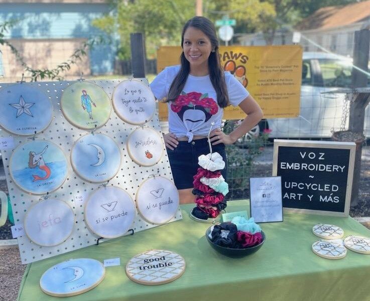 I make embroidery art focused on celebrating Latino culture and advocating for social justice. I also make scrunchies, and I make everything (embroidery included) from upcycled fabrics. Sustainability is really important to me and using repurposed materials is one way I can do my part.