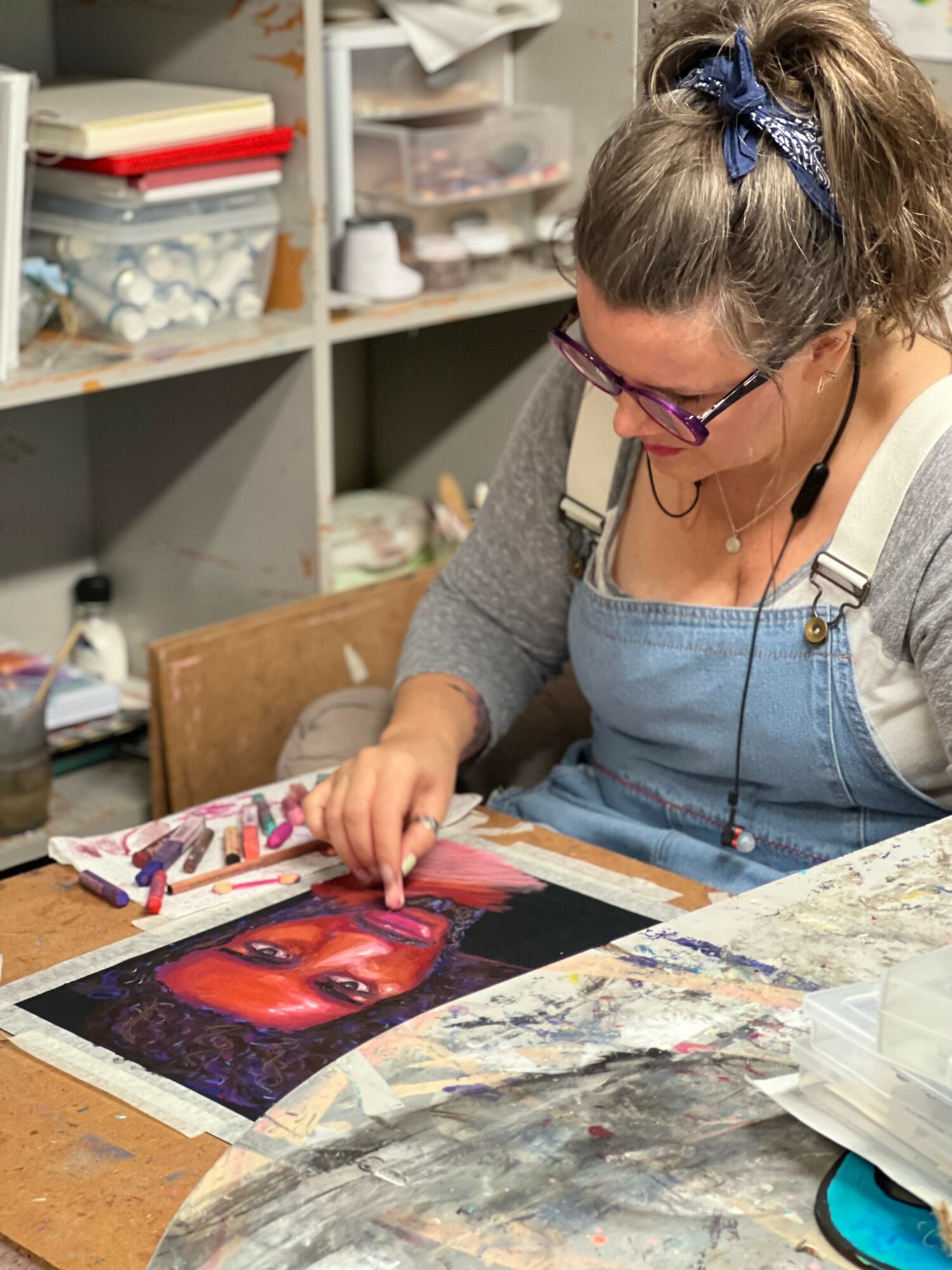 I have always been a creative, imaginative person. As a kid, I was quite shy and awkward and kept to myself. It wasn’t until much later in life that I realized I was on the spectrum and I had synesthesia. All I knew at the time was that I wasn’t like everyone else which made it so hard to fit in anywhere. This gave me a lot of motivation and time to teach myself embroidery and to draw. As I got older, I continued to learn new crafts and started dabbling in painting but I didn’t consider making it a career until later in life. Instead, I got a management job and then eventually got married and became a full-time mom. After my second child, I became severely ill and could no longer work a nine to five job. I was diagnosed with several conditions and it prevented me from living a normal life. I did my best to raise my family and continued my artistic pursuits to cope with life. Once my youngest graduated from High School, although still ill, I began to devote myself to seriously studying art and started drawing or painting every weekday. I took a lot of online classes and practiced every medium I could get. I practiced a lot of different styles of art trying to find my voice. I fell in love with acrylic and oil pastel as my primary mediums. However, I have a secret love affair with watercolor. I try to incorporate my experiences with synesthesia in as much of my art as possible to give the viewer a glimpse inside my world. I devote all my time to art and to knitting. If art is my therapy, knitting is my Zen. I have Fibromyalgia and Secondary Adrenal Insufficiency as well as something called Dercums Disease. As a result, I am in constant pain and spend a lot of time convalescing. Art and knitting keep me sane and help me feel like a productive member of society. I guess that is why I pursue it with such passion. It brings meaning and purpose to my life and gives a voice to my neurodivergent brain.