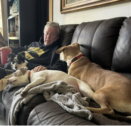 We take a family approach to our wards. During the day, larger dogs have yards to play in, smaller dogs can go in or out of the house. All the dogs sleep in crates inside at night. We try to give every dog individual time, family time, playtime, TV time. We try to keep the number of dogs under 15 at all times, although we have gone over that number a few times due to emergency situations at the shelters such as hoarding or extensive dumping.